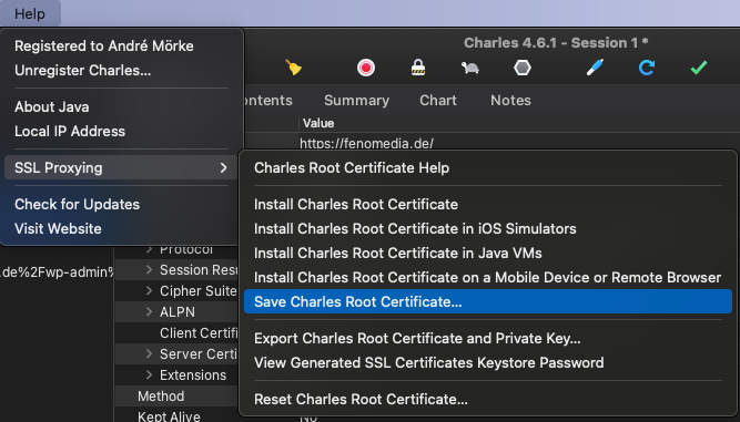 Wichtig: Wenn das Zertifikat abgelaufen Seitn sollte, muss man über „Reset Charles Root Certificate…“ im gleichen Menü ein neues erstellen und auf alle Clients aktualisieren!